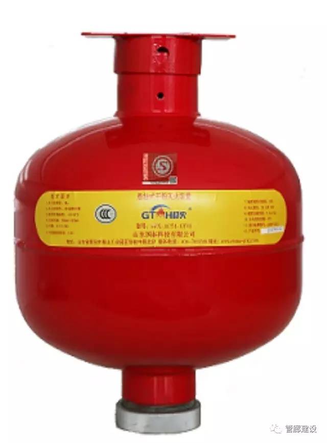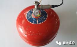 贮压式超细干粉灭火装置:由筒体、超细干粉、喷头、压力指示器、感温玻璃球、吊环组成,筒体内充有低压氮气,当环境温度达到感温玻璃泡温度设定值时,玻璃泡涨破,打开阀门释放灭火剂,实现灭火目的。